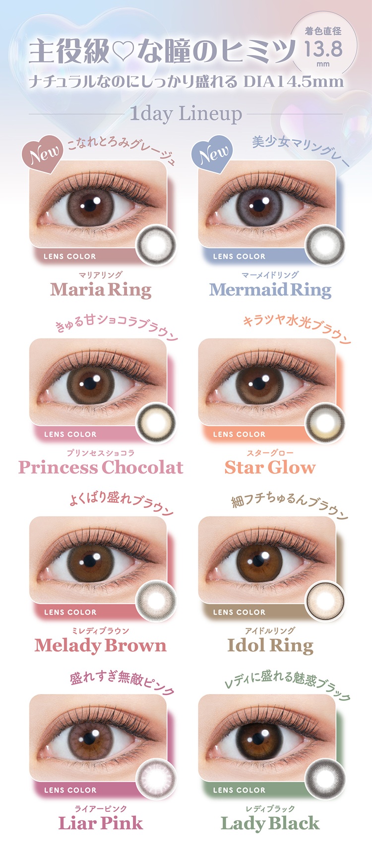 | カラー | マリアリング、マーメイドリング、プリンセスショコラ、 スターグロー、ミレディブラウン、アイドルリング、 ライアーピンク、レディブラック |