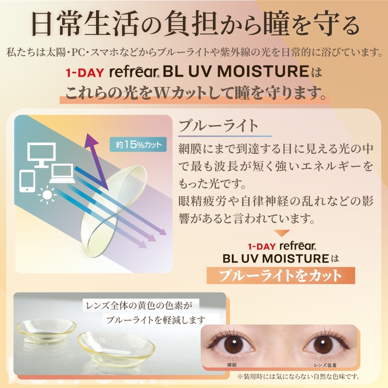 ワンデーリフレア BL UV モイスチャーは黄色く着色されたレンズの色素により、ブルーライトを約15%カットできます。
