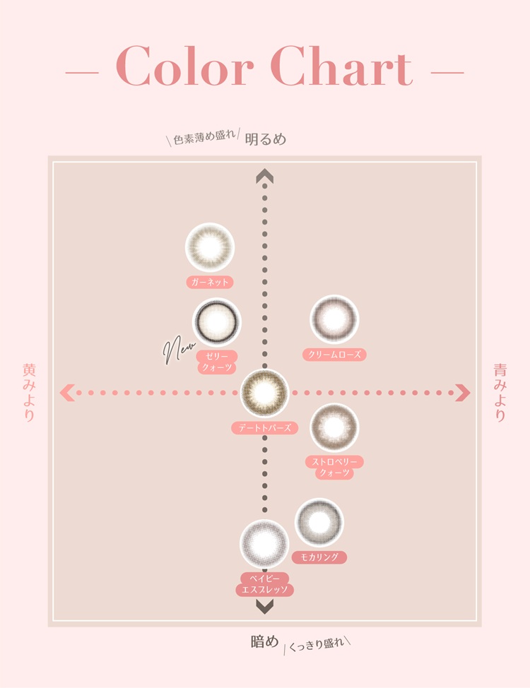 | カラー | ゼリークォーツ、クリームローズ、モカリング、 ベイビーエスプレッソ、デートトパーズ、 ストロベリークォーツ、ガーネット |