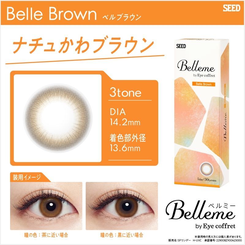 | 着色直径 | ティアーブラウン(着色部外径13.6mm、着色部内径6.6mm) ピーチブラウン(着色部外径13.6mm、着色部内径6.6mm) ベルブラウン(着色部外径13.6mm、着色部内径6.5mm) ヘーゼルリング(着色部外径13.0mm、着色部内径6.5mm) オリーブブラウン(着色部外径13.6mm、着色部内径6.6mm) |