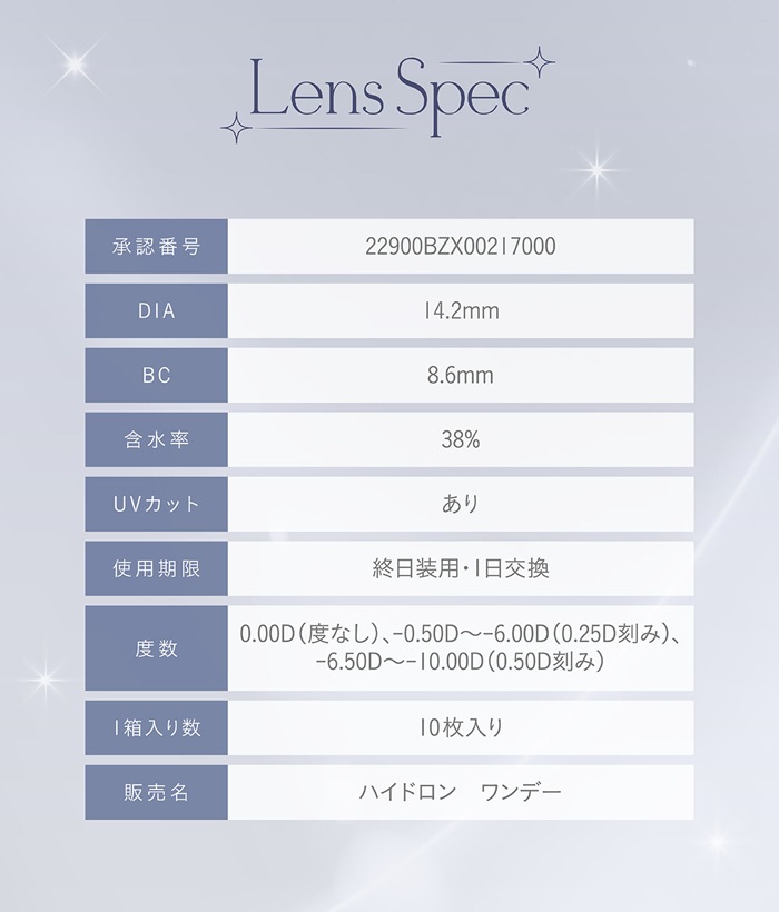 | 度数 | ±0.00D(度なし)、 -0.50D〜-6.00D(0.25Dステップ)、 -6.50D〜-10.00D(0.50Dステップ) |