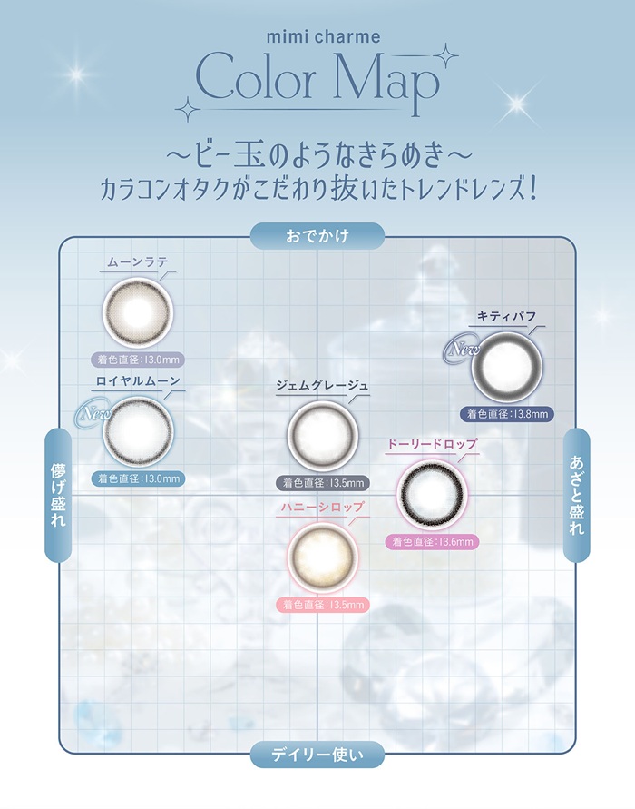 | 着色外径 | 13.0mm:ロイヤルムーン、ムーンラテ 13.5mm:ハニーシロップ、ジャムグレージュ 13.6mm:ドーリードロップ 13.8mm:キティパフ |