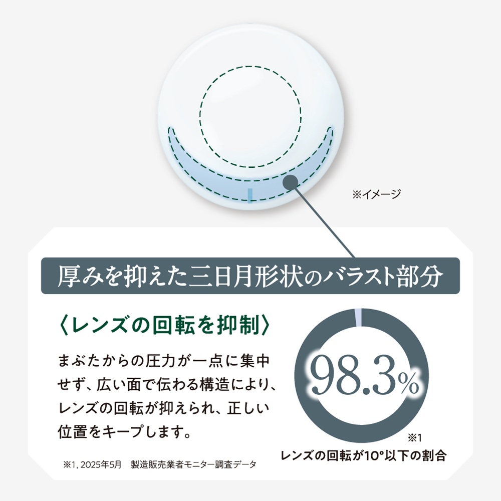 酸素透過率(Dk/L値187)で瞳に大切な酸素をしっかり届けるほか、広い光学領域と厚みを抑えたバラスト設計により、