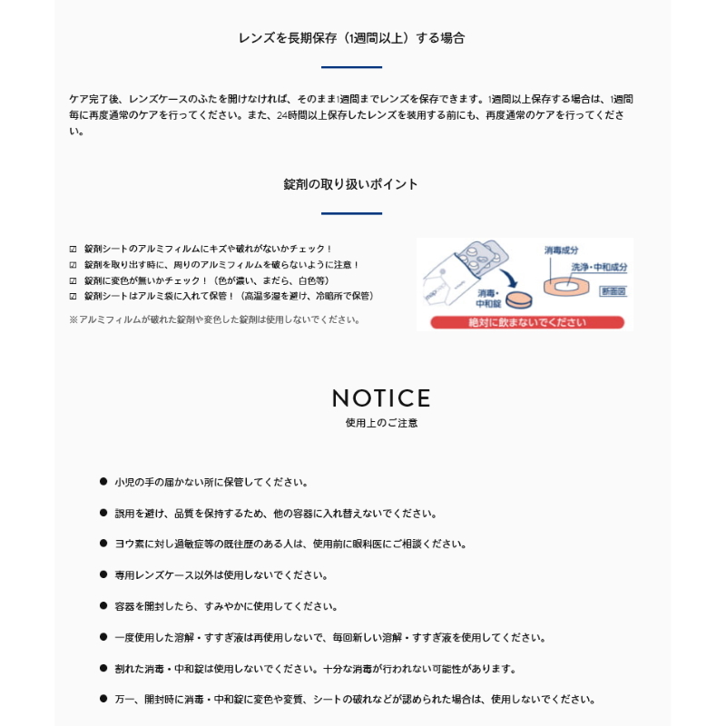 ●万一、開封時に消毒・中和錠に変色や変質、シートの破れなどが認められた場合は、使用しないでください。