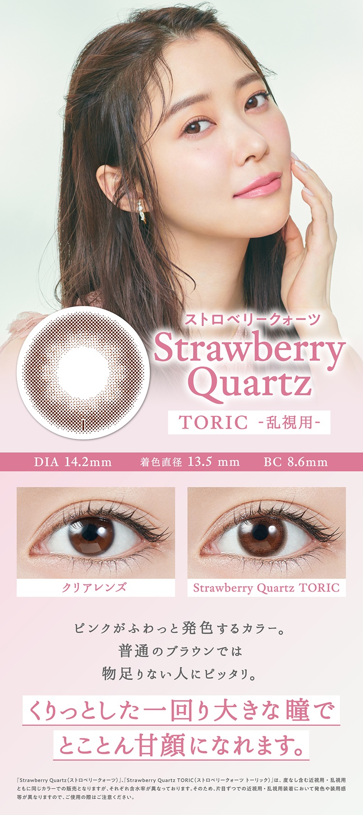 | カラー | ベイビーエスプレッソ トーリック、 デートトパーズ トーリック、 ストロベリークォーツ トーリック、 オパール トーリック |