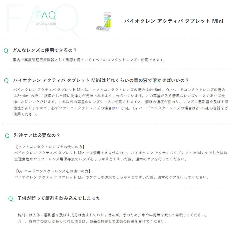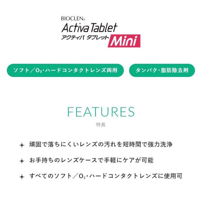 アクティバ タブレット Miniは通常ケアに週1回プラスするだけのソフト/O2・ハードコンタクトレンズ用強力タンパク脂肪除去剤です。