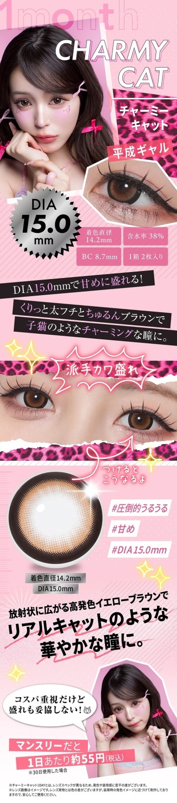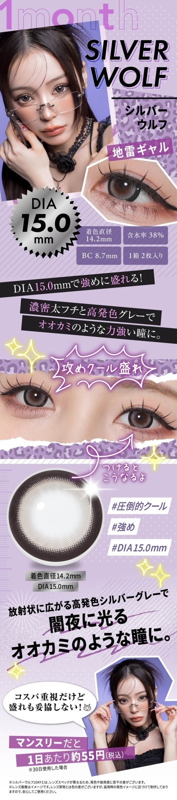 | サイズ/着色直径 | シルバーウルフ(DIA:15.0mm/着色直径:14.2mm) チャーミーキャット(DIA:15.0mm/着色直径:14.2mm) スパイシークイーン(DIA:14.5mm/着色直径:13.7mm) バッドガール(DIA:14.5mm/着色直径:13.7mm) |