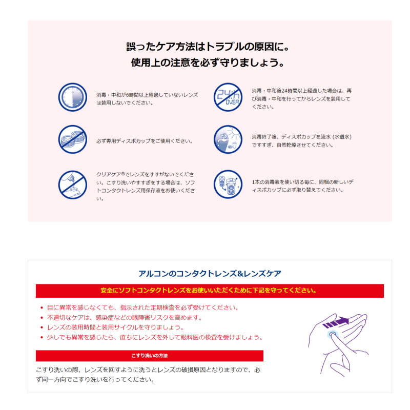 (2)クリアケア(本剤)でレンズを装用前にすすがないでください。こすり洗いやすすぎをする場合は、ソフトコンタクトレンズ用保存液(別売)をお使いください。