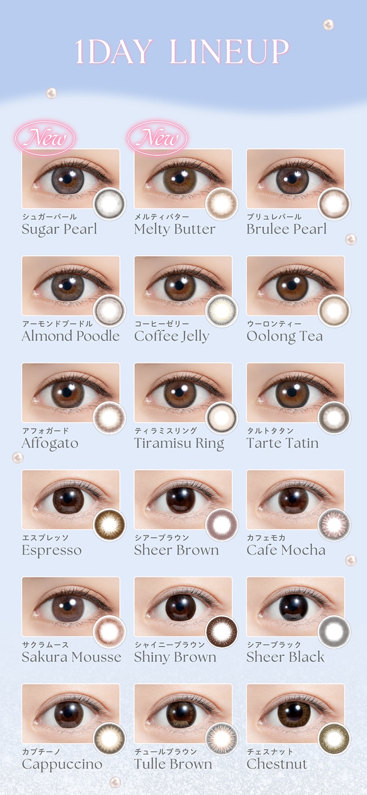 大きさ (直径/着色直径) | シュガーパール(14.2mm/13.5mm) メルティバター(14.5mm/13.7mm) ブリュレパール(14.2mm/13.5mm) アーモンドプードル(14.5mm/13.7mm) ウーロンティー(14.2mm/13.0mm) タルトタタン(14.5mm/13.7mm) サクラムース(14.5mm/13.7mm) ティラミスリング(14.5mm/13.7mm) アフォガード(14.2mm/13.6mm) コーヒーゼリー(14.2mm/13.0mm) エスプレッソ(14.5mm/13.5mm) カフェモカ(14.5mm/13.5mm) カプチーノ(14.2mm/13.0mm) シアーブラウン(14.2mm/13.0mm) シャイニーブラウン(14.5mm/13.5mm) シアーブラック(14.2mm/13.0mm) チュールブラウン(14.2mm/13.3mm) チェスナット(14.5mm/13.5mm) |