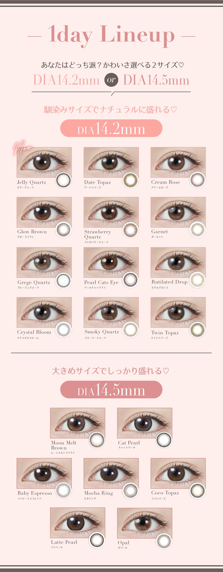 | カラー | ゼリークォーツ、ムーンメルトブラウン、キャットパール、 ベイビーエスプレッソ、モカリング、ココトパーズ、ラテパール、 クリームローズ、グローブラウン、ルチルドロップ、 クリスタルブルーム、ガーネット、スモーキークォーツ、 ツイントパーズ、パールキャッツアイ、グレージュクォーツ、 オパール、デートトパーズ、ストロベリークォーツ |